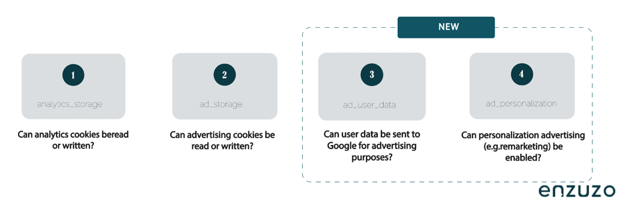 Consent Mode V2 keeps the original storage signals (ad_storage and analytics_storage) and adds ad_user_data and ad_personalization to provide more granular control over user data for advertising and personalization: