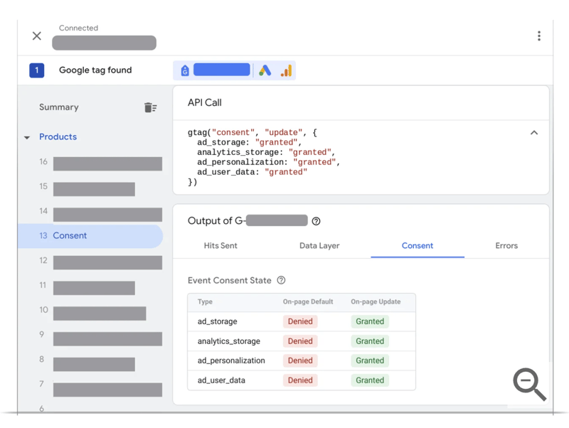 Google recommends Tag Assistant to verify whether Consent Mode is implemented correctly. A simple check looks like this: